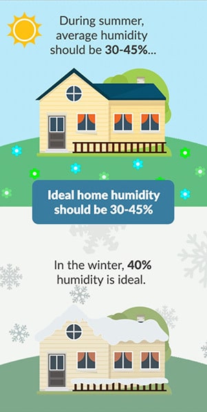 This probably has you asking, “What should humidity be in the house in winter, summer and throughout the year? During the colder, winter months staying below 40% humidity is ideal, while in hot, summer months the average humidity should be between 30-45% (or below 50%, depending on your preferences).